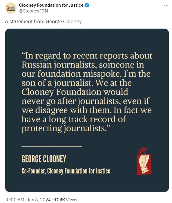 "Что касается недавних сообщений о российских журналистах, кто-то в нашем фонде оговорился. Я сын журналиста. Мы в Фонде Клуни никогда не будем преследовать журналистов, даже если мы с ними не согласны. На самом деле у нас большой опыт защиты журналистов", - приводит аккаунт Фонда слова актера.