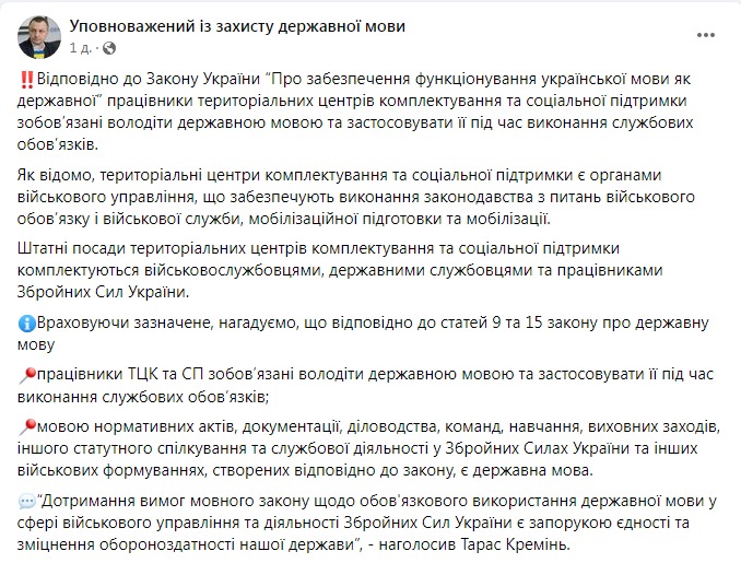 "В соответствии с законом Украины "Об обеспечении функционирования украинского языка как государственного" работники территориальных центров комплектования и социальной поддержки обязаны владеть государственным языком и применять его при исполнении служебных обязанностей", - сказано в публикации.