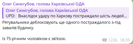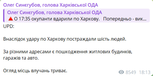 18:24 В результате прилета авиабомб по Харькову пострадали шесть человек, сообщает глава ОВА Синегубов.
