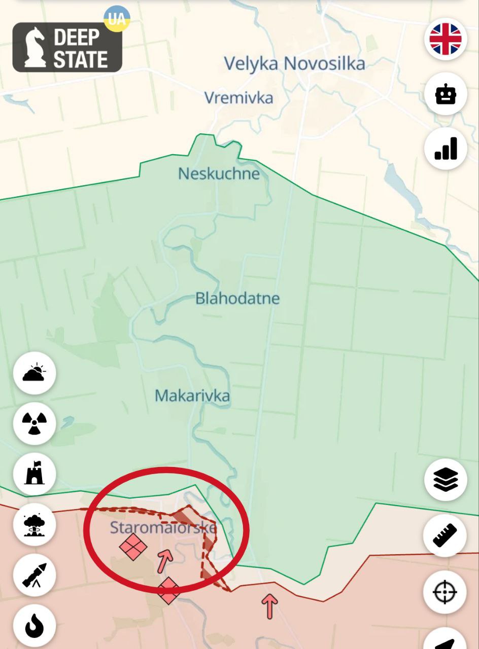 Также паблик сообщает, что россияне продвинулись в Старомайорском на Времьевском выступе.
