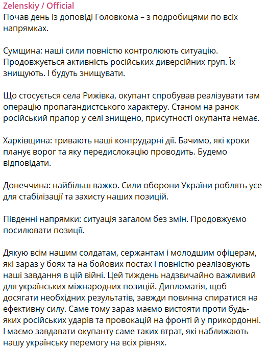 "Что касается села Рыжевка, оккупант попытался реализовать там операцию пропагандистского характера. По состоянию на утро российский флаг в селе уничтожен, присутствия оккупанта нет", - пишет президент.