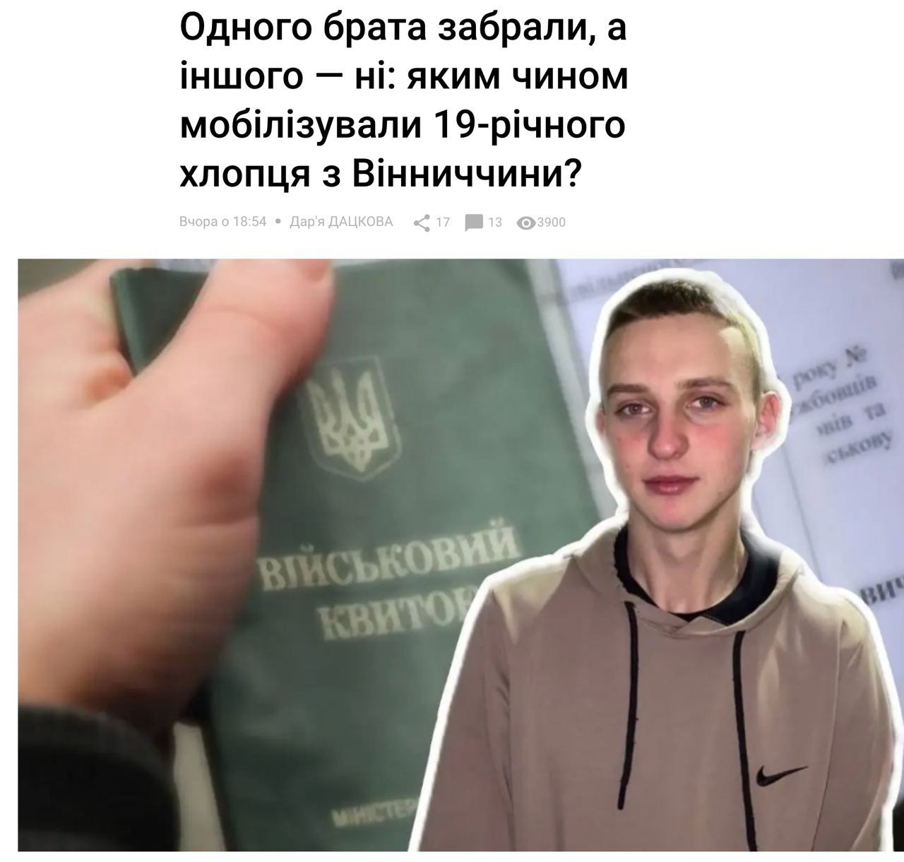 Он прокомментировал ситуацию в Винницкой области, когда двух 19-летних братьев забрали с рыбалки в ТЦК, после чего одного из них (с проблемами со здоровьем) мобилизовали, а второго (без проблем со здоровьем) отпустили домой.