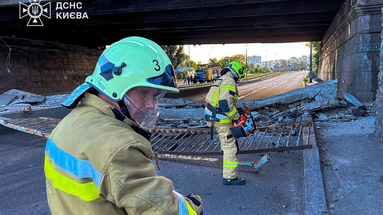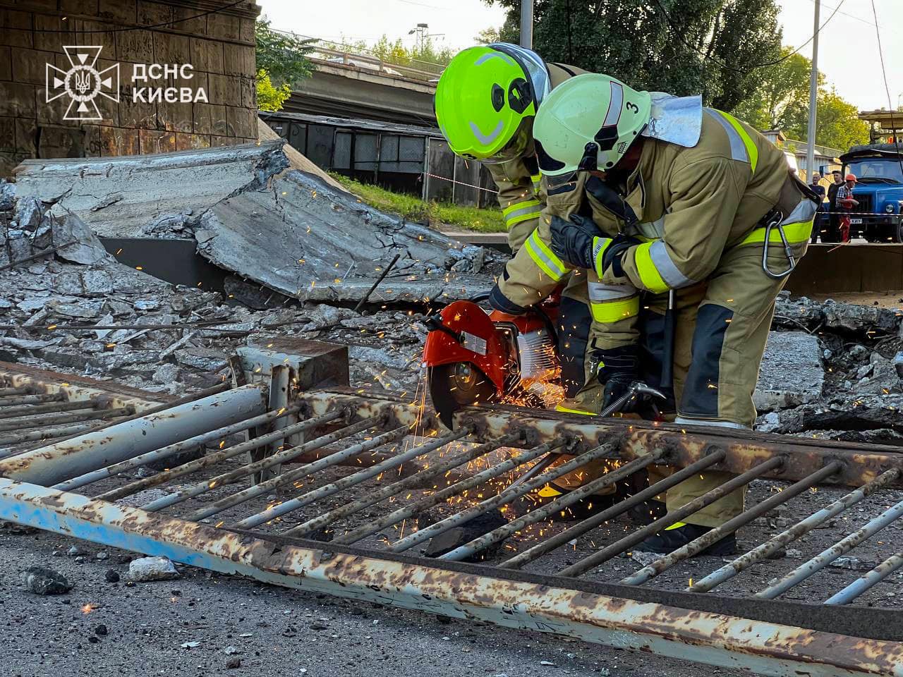 В ГСЧС Киева сообщили, что спасатели разрезают металлические конструкции с помощью гидро- и электроинструмента. Также производится расчистка дороги от разрушенных конструкций.