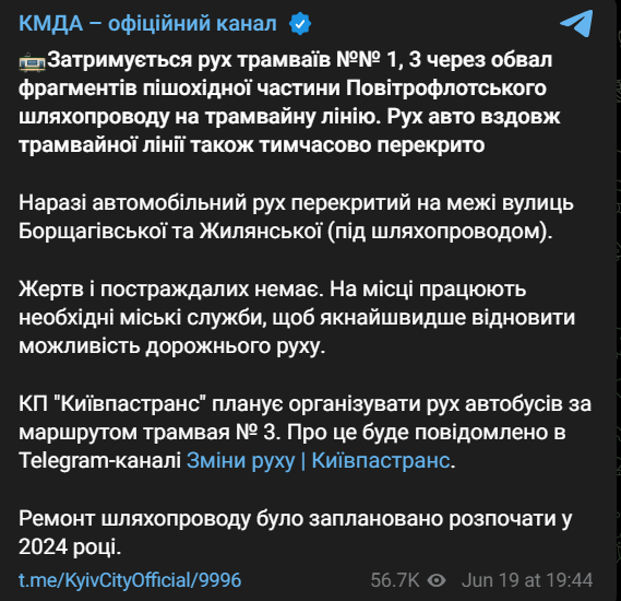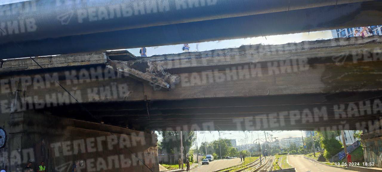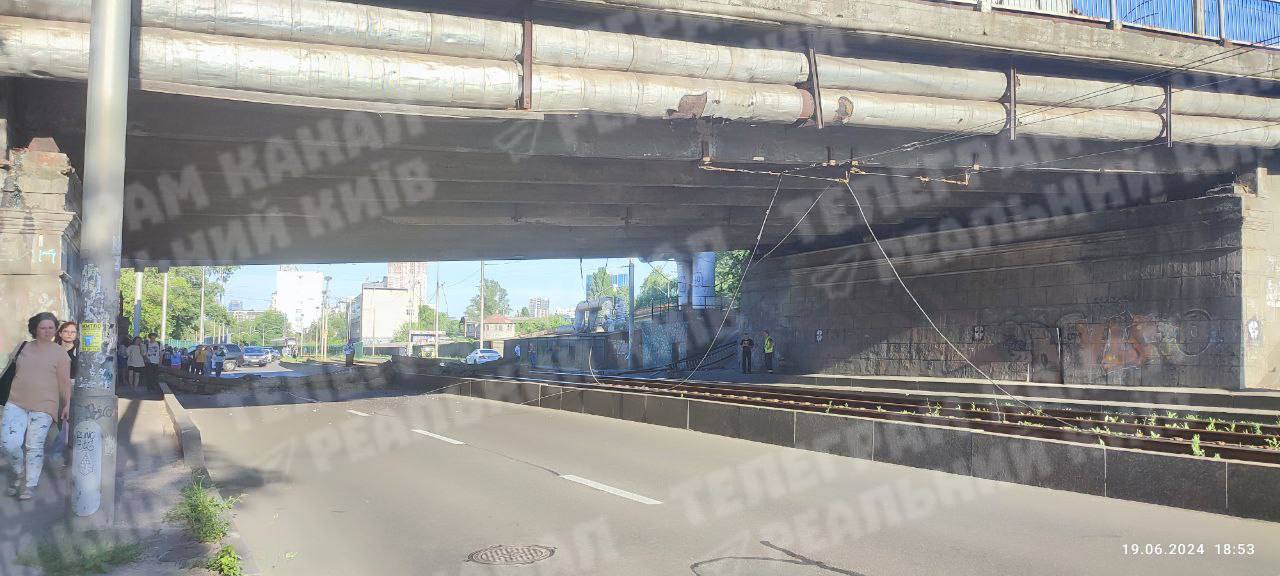На трамвайный путь в Киеве рухнула часть Воздухофлотского моста. Движение парализовано. Фото и видео