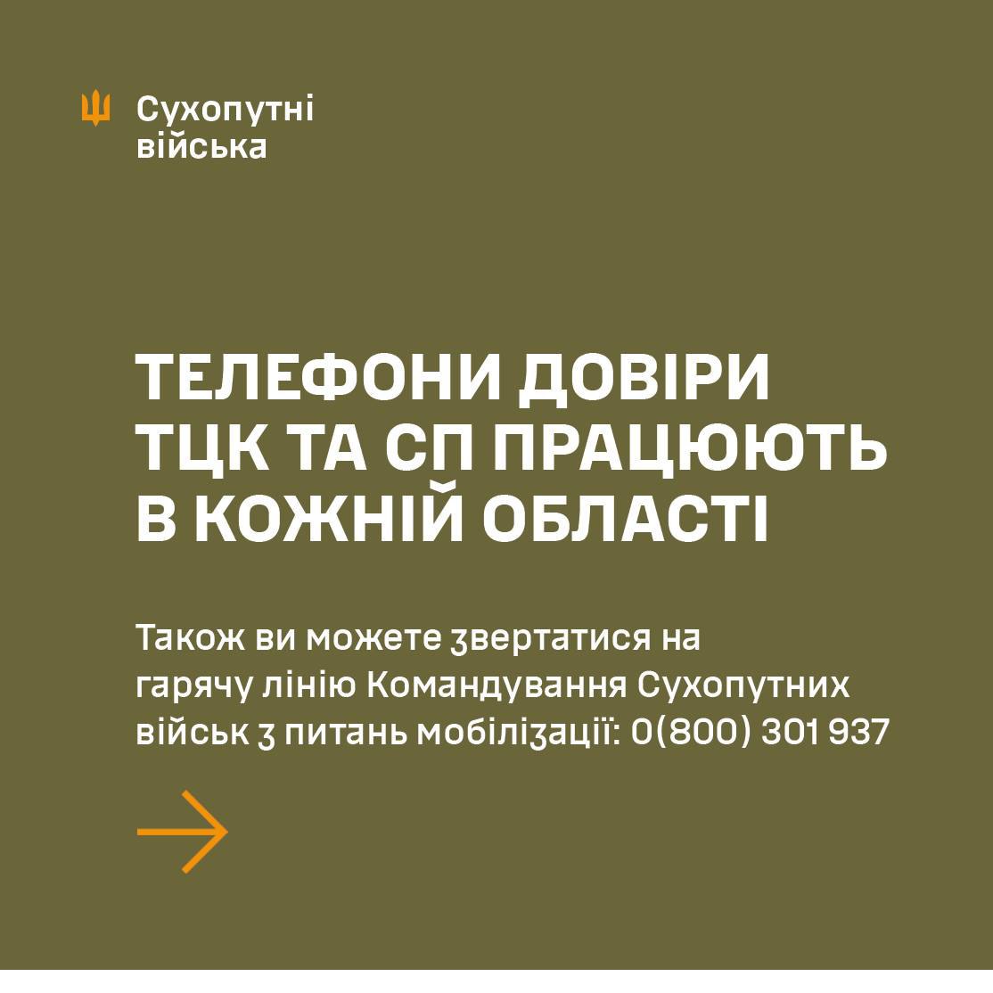 В командовании Сухопутных войск действует горячая линия для оперативного реагирования на противоправные действия представителей ТЦК и предоставление консультаций: 0 800 301937.