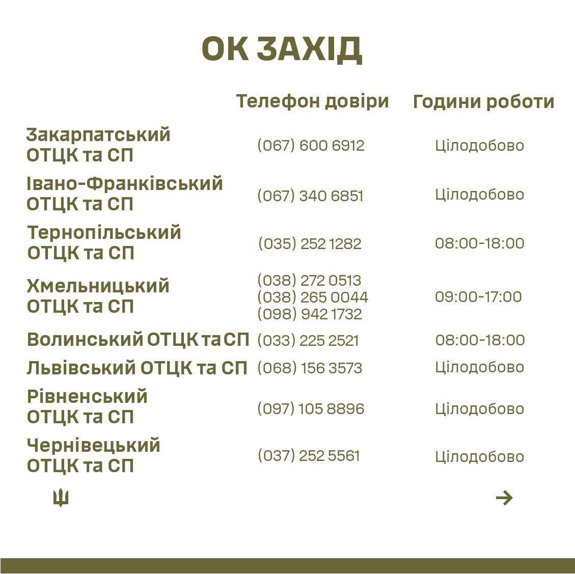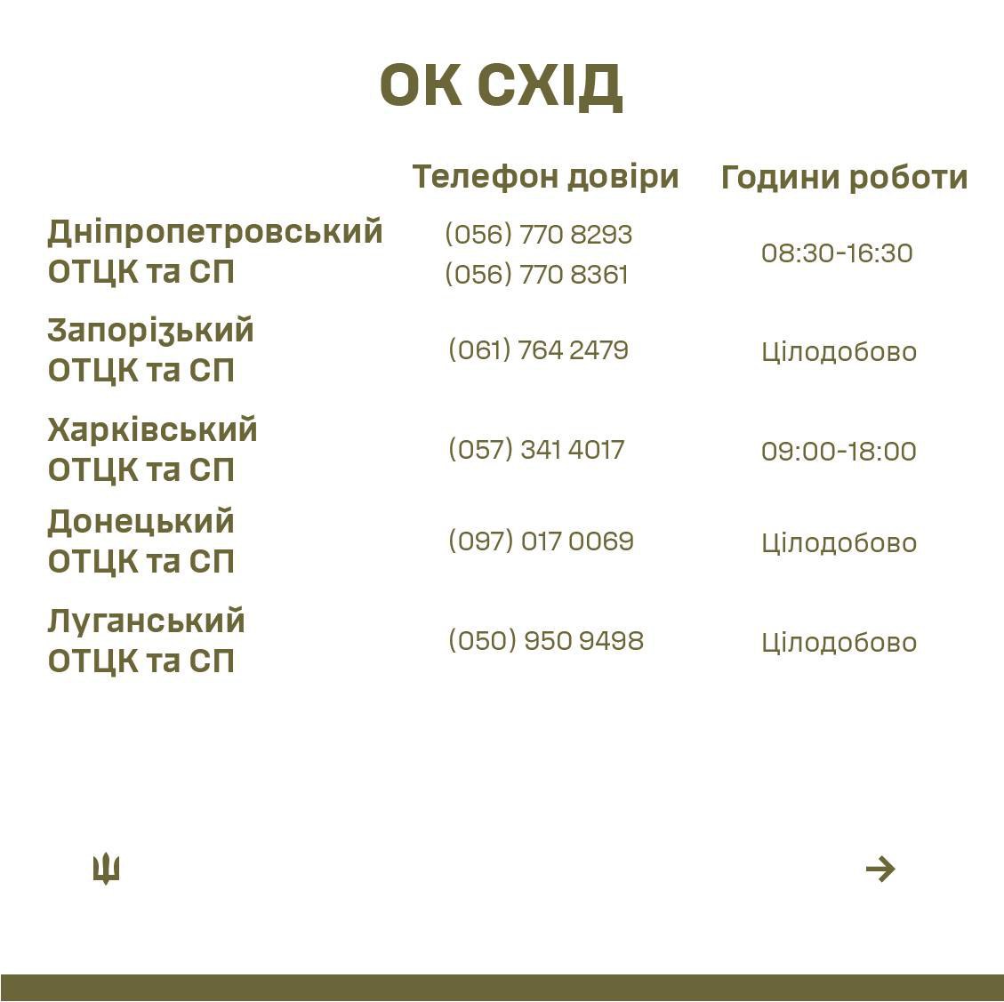 Кроме того, по решению командующего Сухопутными войсками отдельные контактные номера действуют также в областях. А в каждом ОТЦК и СП по телефонам предоставляют консультации гражданским, военнослужащим и членам их семей, в том числе по вопросам социальной поддержки.