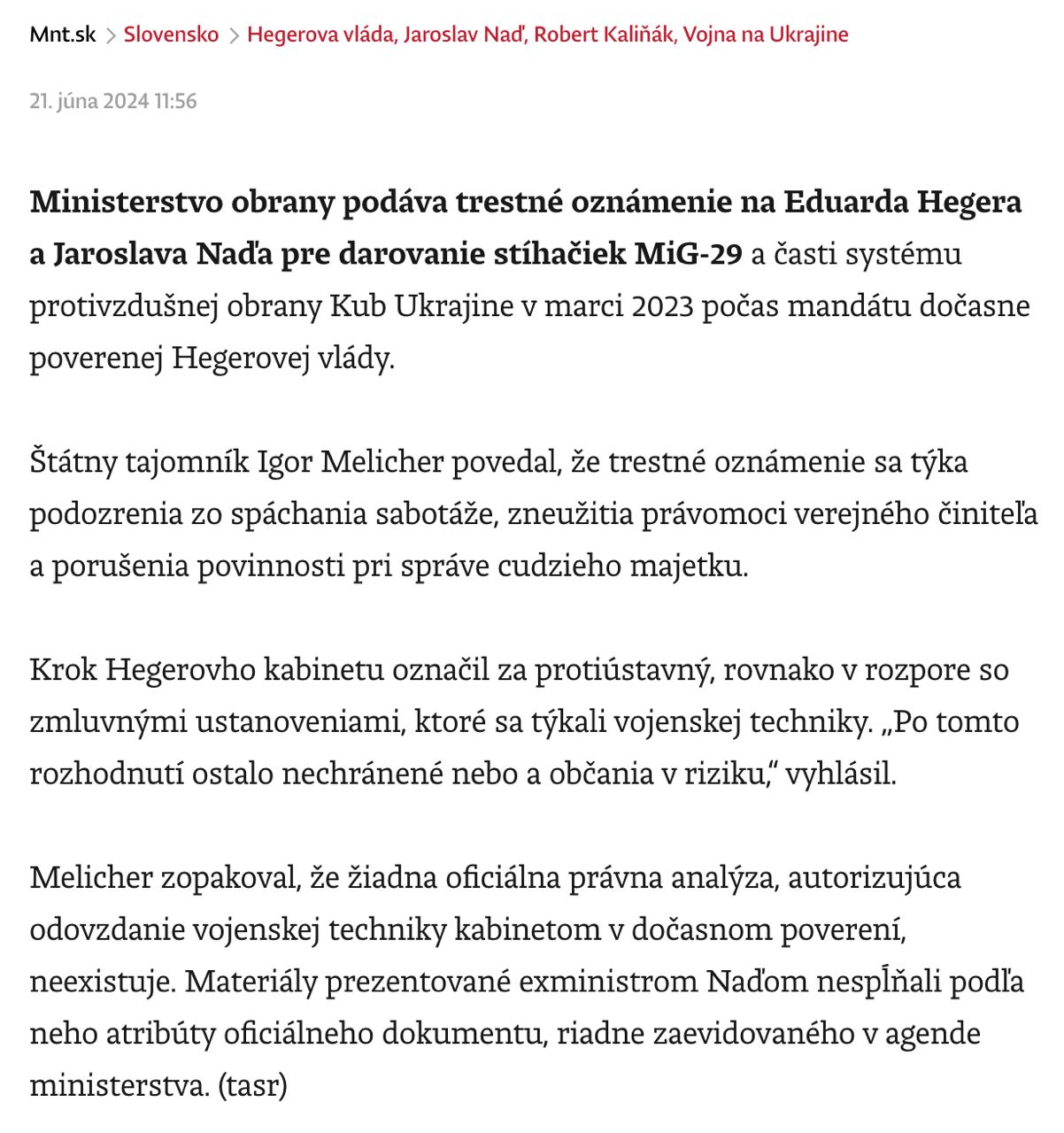 Новое руководство Словакии подает в суд на своих предшественников из-за передачи Украине истребителей МиГ-29 и комплектующих для ЗРК "Куб" в марте 2023 года.