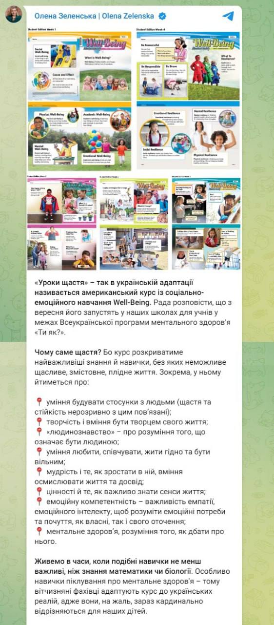 В основе уроков будет лежать американский курс по социально-эмоциональному обучению "Well-Being" (в переводе с английского - благополучие). Курс стартует в рамках курируемой женой президента Владимира Зеленского всеукраинской программы ментального здоровья "Ты как?".