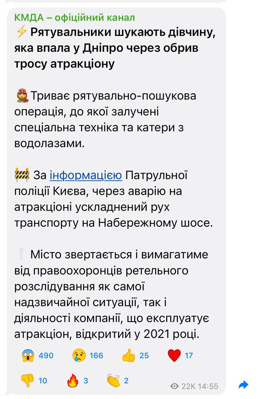 Столичные власти заявили, что с троса, оборвавшегося над Днепром в Киеве, упала девушка, и потребовали от правоохранительных органов расследовать деятельность компании-оператора аттракциона, на котором произошла трагедия.