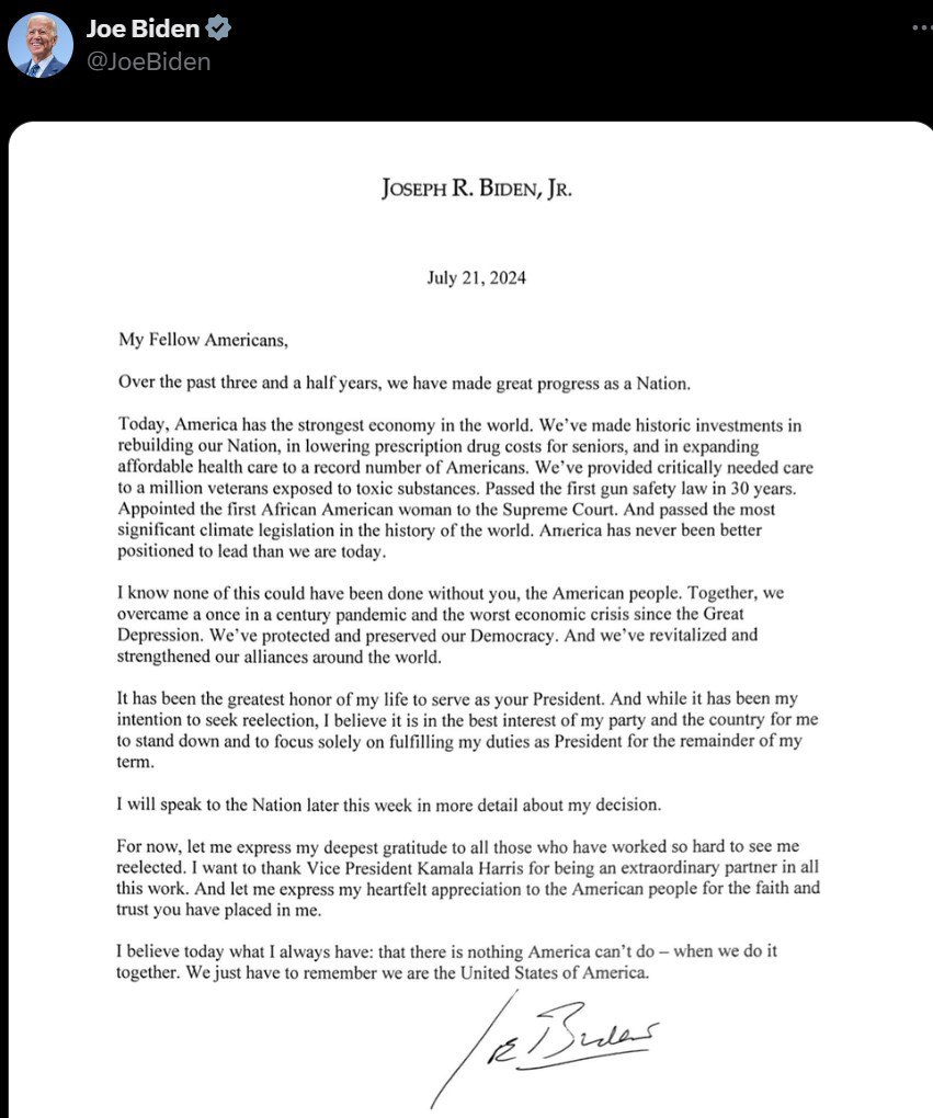 Заявление о снятии с предвыборной гонки Байден опубликовал в соцсетях.
