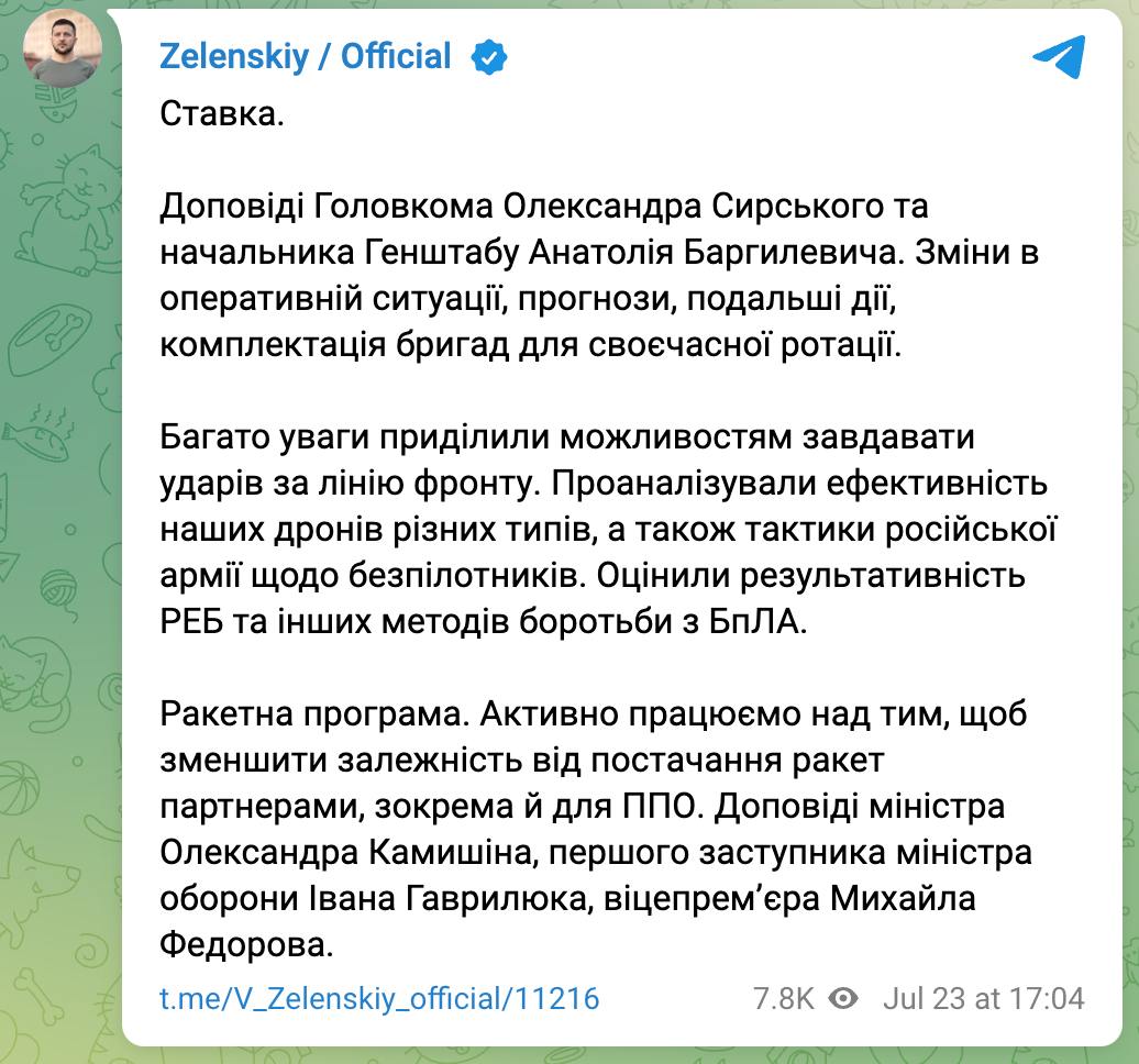 17.08 На Ставке верховного главнокомандующего обсуждали "изменения оперативной ситуации", а также производство в Украине ракет, пишет Зеленский. О каких именно изменениях идет речь, он не уточнил.