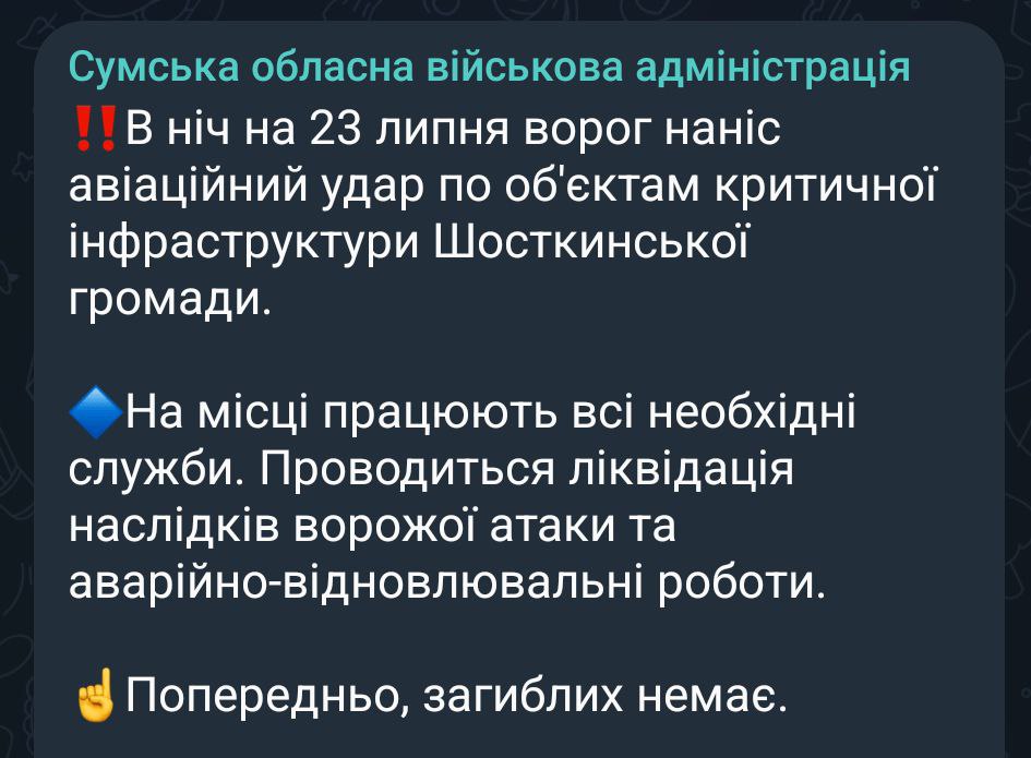 При этом Сумская ОВА ранее сообщала об авиаударе по объекту критической инфраструктуры под Шосткой.
