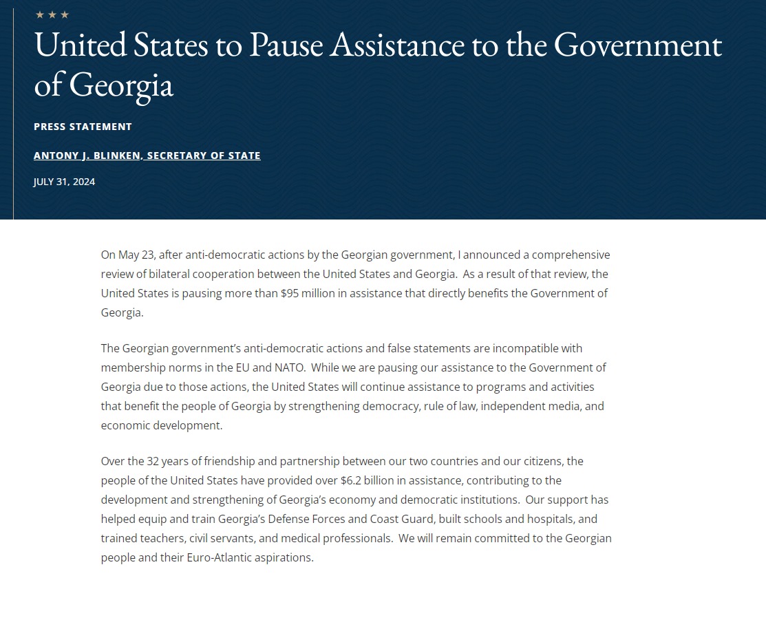 "23 мая, после антидемократических действий грузинского правительства, я объявил о всеобъемлющем пересмотре двустороннего сотрудничества между Соединенными Штатами и Грузией. В результате этого пересмотра Соединенные Штаты приостанавливают выделение более 95 миллионов долларов помощи, которая напрямую выгодна правительству Грузии", - сказано в заявлении.