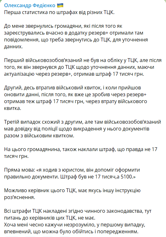 ТЦК штрафуют даже тех, кто обновил данные в "Резерв+". Народный депутат Александр Федиенко рассказал о первых штрафах от разных ТЦК в своем Telegram-канале.
