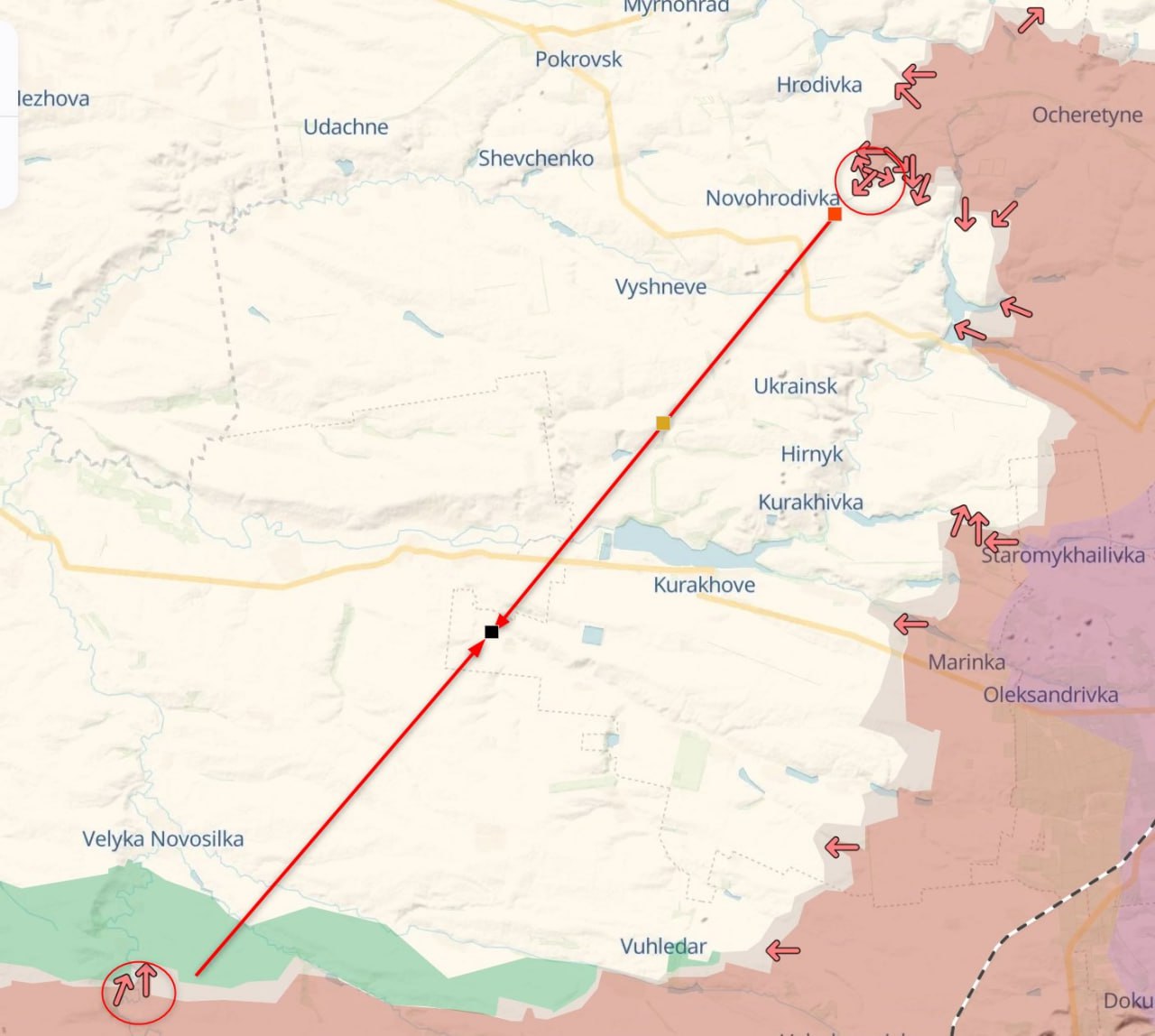 Однако, если посмотреть на карту боевых действий в динамике, то в последнее время российские войска продвигаются в основном не на север (к трассе), и не на запад (к Покровску), а на юго-запад - в сторону Желанного, Николаевки, Новогродовки и т.д.