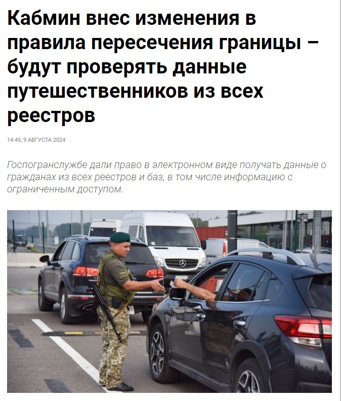 Кабинет министров дал Государственной погранслужбе Украины (ГПСУ) доступ ко всем электронным базам и реестрам, в том числе с ограниченным доступом. Также пограничники получат доступ к данным государственных и муниципальных банков. Это сделано для проверки украинцев, пересекающих границу.