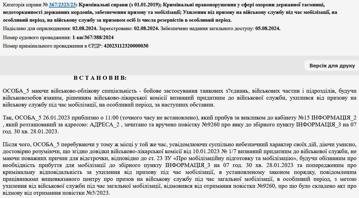 Согласно приговору суда, мужчина отказался получить повестку и не явился в ТЦК.