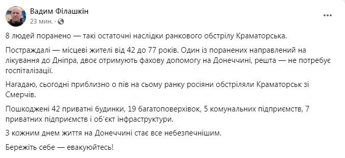 Сегодня утром примерно в 6:30 подвергся обстрелу из РСЗО "Смерч" Краматорск Донецкой области. Восемь человек были ранены.