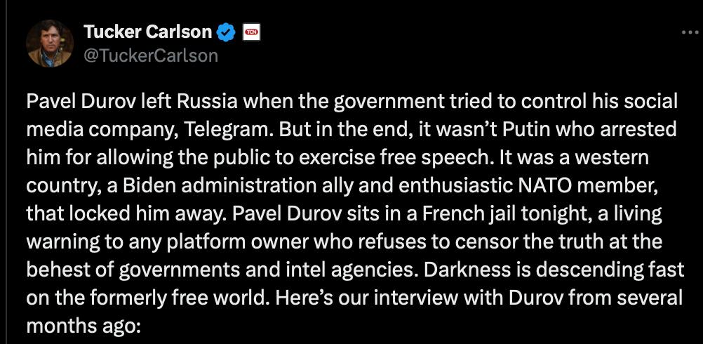 "Павел Дуров покинул Россию, когда правительство попыталось взять под контроль его социальную сеть Telegram. Но в конце концов, это не Путин арестовал его за то, что он позволил общественности осуществлять свободу слова. Это западная страна, союзник администрации Байдена и активный член НАТО, заперла его. Павел Дуров сегодня сидит во французской тюрьме, живое предупреждение любому владельцу платформы, который отказывается цензурировать правду по приказу правительств и разведывательных служб. Тьма быстро опускается на некогда свободный мир", - написал Карлсон в Х.
