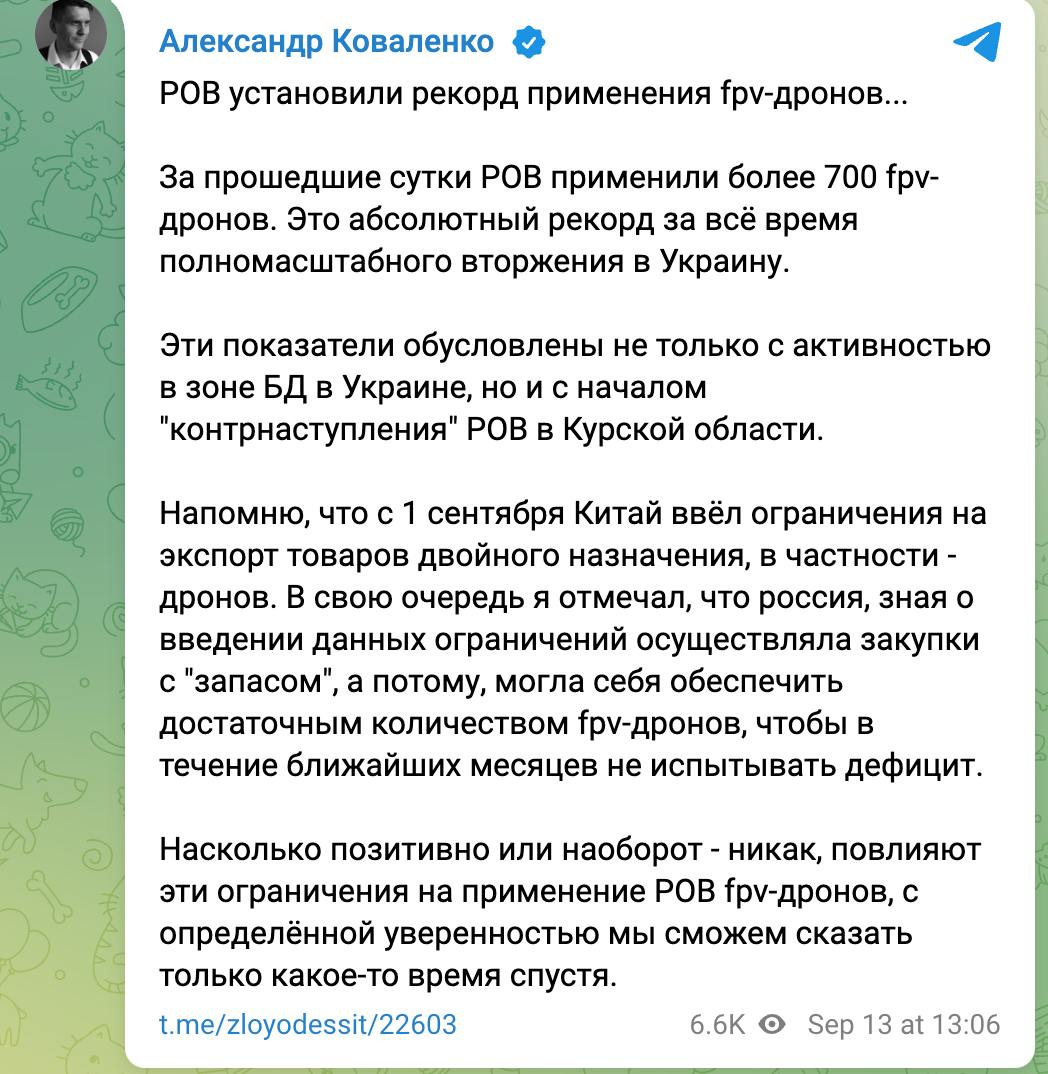 К слову, как сообщил эксперт "Информационного сопротивления" Александр Коваленко, за минувшие сутки россияне применили на фронте рекордное количество FPV-дронов — 700 единиц. По его данным, это обусловлено началом российского контрнаступления в Курской области.