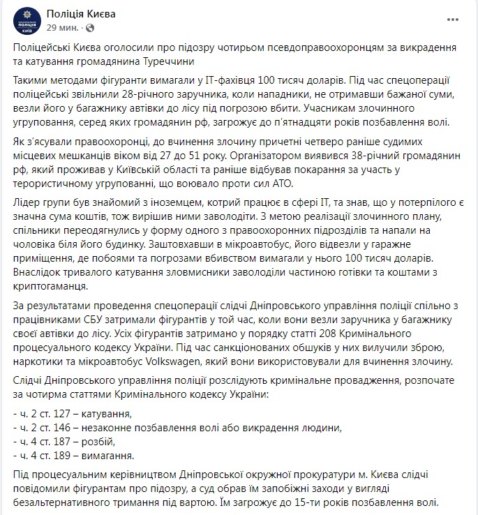 В Киеве четверо мужчин, выдавая себя за правоохранителей, похитили и пытали 28-летнего IT-специалиста из Турции, требуя с него 100 тысяч долларов.