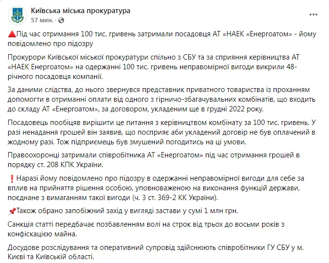 Правоохранители задержали сотрудника "Энергоатома" прямо во время получения денег в порядке. Ему сообщили о подозрении в получении неправомерной выгоды по ч. 3 ст. 369-2 Уголовного кодекса и избрали меру пресечения в виде залога в миллион гривен. Санкция статьи предусматривает лишение свободы на срок от трех до восьми лет с конфискацией имущества.
