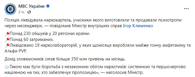 Для разоблачения сети торговли наркотиками было проведено более 230 обысков в 20 регионах страны. Более 60 человек задержали, также ликвидировано 19 нарколабораторий, в которых ежемесячно производили почти тонну амфетамина и синтетического психостимулятора класса катинонов альфа-PVP.