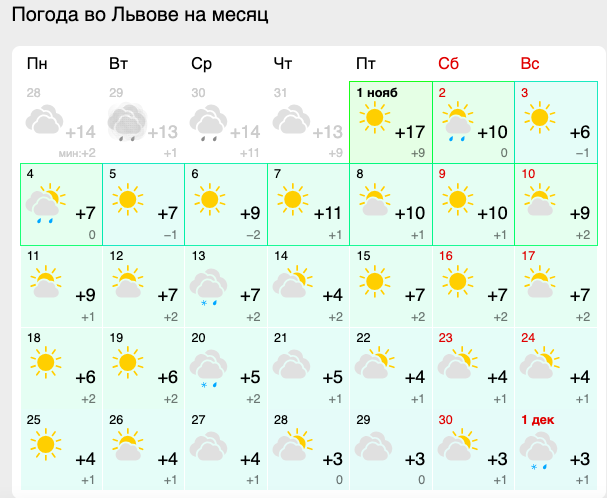 Во Львове на этот раз будет теплее, чем в центре и на востоке страны. Вплоть до 20-х чисел ноября днем будет +10...+6. Лишь потом похолодает до +4 в дневное время и нулевых значений в ночное.