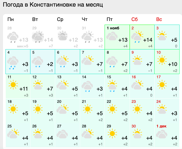 В Константиновке Донецкой области первая половина месяца будет с дождями — из 15 дней осадки ожидаются в течение 7 дней.