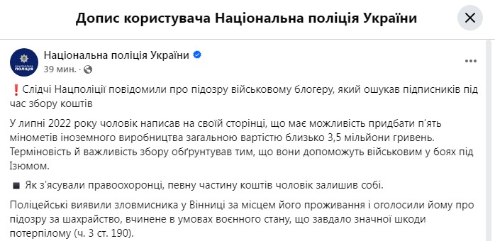 Полицейские обнаружили злоумышленника в Виннице по месту его жительства и объявили ему о подозрении за мошенничество, совершенное в условиях военного положения.
