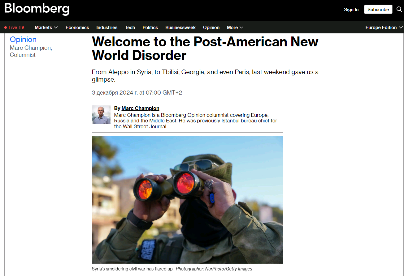 "Если вам интересно узнать, как будет выглядеть постамериканский мир, внимательно посмотрите на то, что происходило в последние несколько дней, и вы получите, как я полагаю, довольно точную картину. В Сирии разгорелась тлеющая гражданская война, и исламистская террористическая организация "Хайят Тахрир аш-Шам" вновь захватила северный город Алеппо. Никто не спрашивал разрешения США на эти действия. А Израиль проигнорировал противодействие США его вторжению в Ливан и продолжающейся войне в Газе", - написал Чемпион.