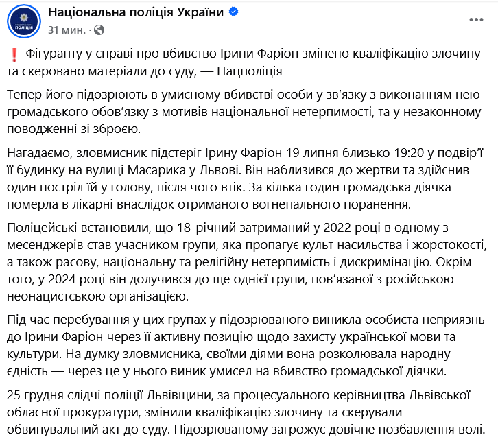 "В 2022 году подозреваемый в одном из мессенджеров стал участником группы, пропагандирующей культ насилия и жестокости, а также расовой, национальной и религиозной нетерпимости. В 2024 году он присоединился к еще одной группе, связанной с российской неонацистской организацией. Во время пребывания в этих группах у подозреваемого возникла личная неприязнь к Ирине Фарион из-за ее активной позиции по защите украинского языка и культуры. По мнению злоумышленника, своими действиями она раскалывала народное единство – из-за этого у него возник умысел на убийство общественного деятеля", - пишет полиция.