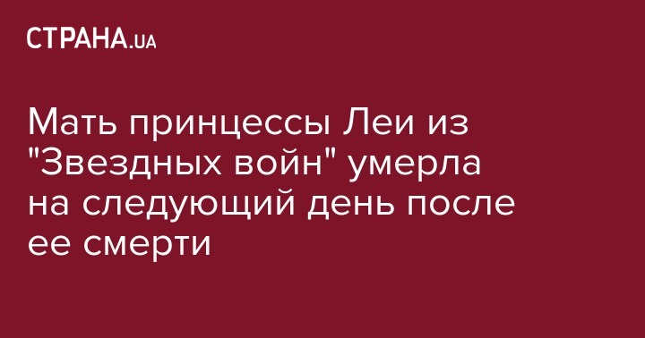 28 декабря в США умерла мать Кэрри Фишер, актрисы, сыгравшей принцессу Лею в "Звездных войнах". Актриса и певица Дебби Рейнольдс скончалась в возрасте 84 лет, на следующий день после смерти дочери. Об этом сообщает Русская служба ВВС.