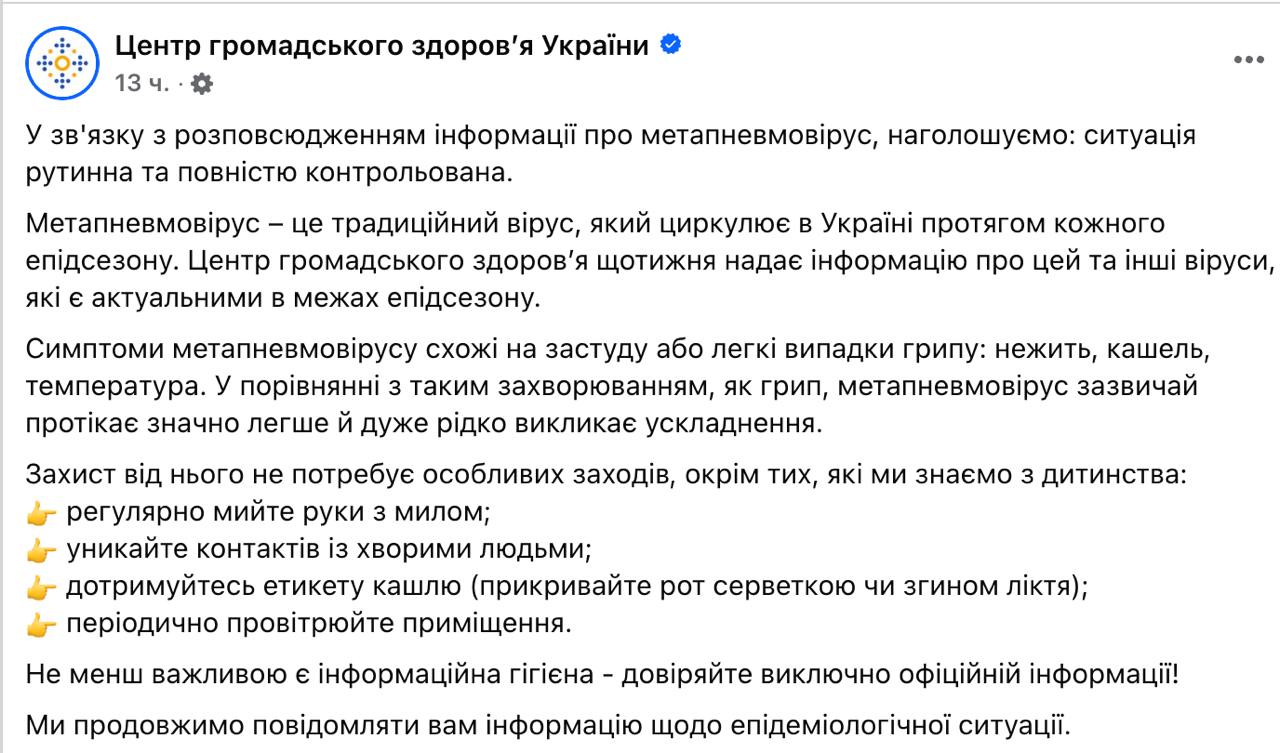 "Ситуация рутинная и полностью контролируемая. Метапневмовирус - это традиционный вирус, который циркулирует в Украине в течение каждого эпидсезона. По сравнению с таким заболеванием, как грипп, метапневмовирус обычно протекает значительно легче и очень редко вызывает осложнения", - сообщает ведомство.