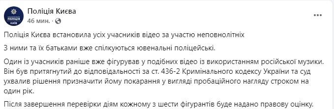Один из молодых людей уже мелькал в подобных видео с использованием российской музыки. Его привлекали к ответственности по ст. 436-2 Уголовного кодекса Украины, и суд принял решение назначить наказание в виде пробационного надзора сроком один год.