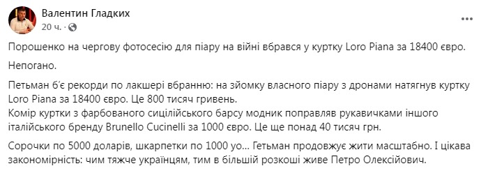 По его словам, в ролике на Порошенко надеты куртка от Loro Piana за 18,4 тысяч евро (это примерно 800 тысяч гривен) с воротником из крашеного сицилийского барса, а также перчатки бренда Brunello Cucine за 1 тысячу евро (более 40 тысяч гривен).