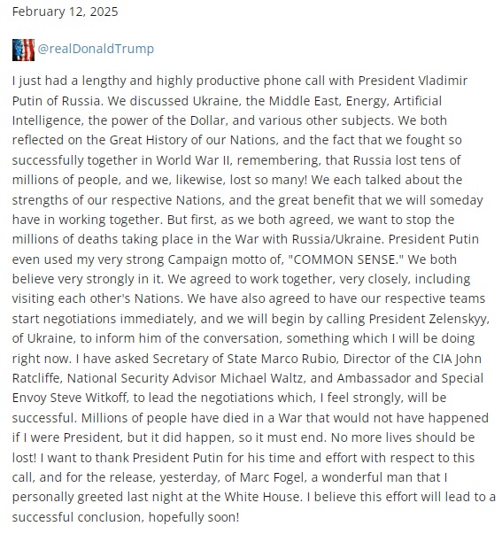 Напомним, Трамп провел телефонный разговор с российским лидером 12 февраля.