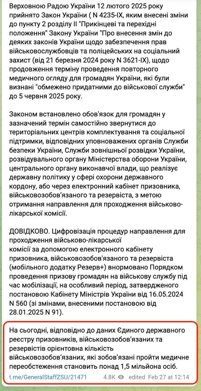 "На сегодняшний день, согласно данным Единого государственного реестра призывников, военнообязанных и резервистов, ориентировочное количество военнообязанных, которые обязаны пройти медицинское переобследование, составляет более 1,5 миллиона человек", - говорится в сообщении.