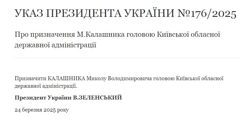 "Назначить Калашника Николая Владимировича главой Киевской облгосадминистрации", - сказано в тексте указа.