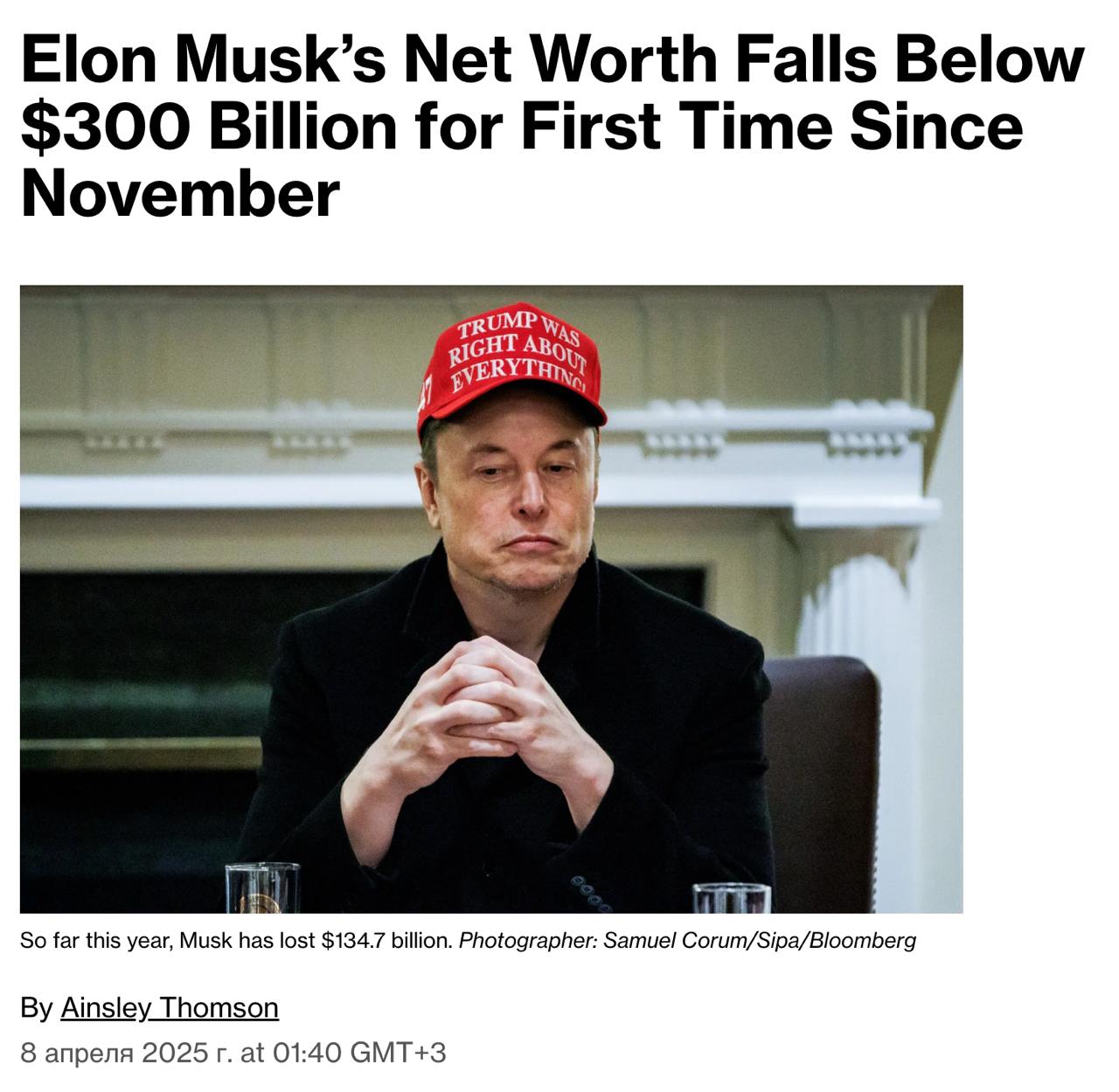 В Bloomberg отмечают, что из-за тарифов состояние главы Tesla впервые с ноября опустилось ниже 300 миллиардов долларов.