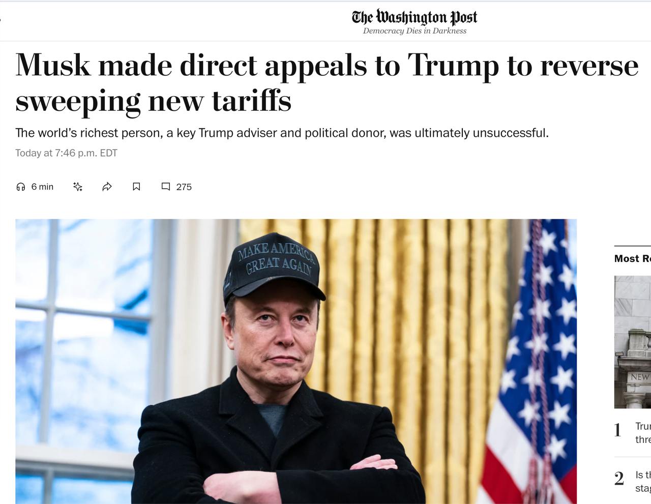 Его брат Кимбал Маск в понедельник также раскритиковал тарифы, назвав их "структурным, постоянным налогом для американского потребителя".