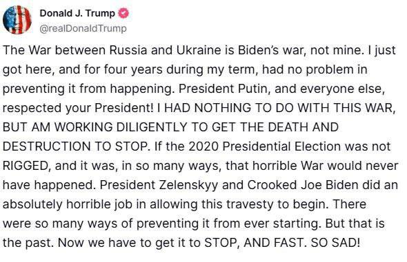 "Война между Россией и Украиной - это война Байдена, не моя. Я не имел никакого отношения к этой войне, но сейчас прилагаю усилия, чтобы остановить смерть и разрушения. Если бы президентские выборы 2020 года не были сфальсифицированы, этой ужасной войны никогда бы не произошло. Президент Зеленский и лживый Джо Байден сделали ужасную работу, позволив начаться этой трагедии. Существовало множество способов её предотвратить. Но это уже в прошлом. Сейчас нужно остановить это - и быстро", - написал Трамп.