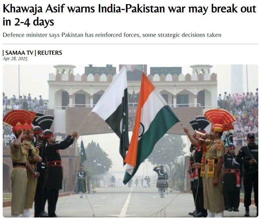 Пакистанский министр обороны Хаваджа Асиф сперва заявил, что война между Индией и Пакистаном может начаться через два-четыре дня, а позже уточнил, что не прогнозировал начало войны в течение ближайших дней.