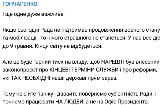 Позже он также написал, что "если сегодня Рада не поддержит продолжение военного положения и мобилизации - ничего страшного не произойдет. У нас все действует до 9 мая. Конца света не состоится".