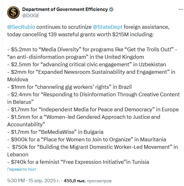 Государственный департамент США отменил 139 бесполезных грантов зарубежным странам на сумму 215 миллионов долларов.