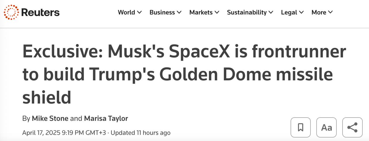 Компания Маска сотрудничает с производителем программного обеспечения Palantir и производителем беспилотников Anduril в рамках тендера на строительство ключевых частей Golden Dome. Все три компании основаны предпринимателями, которые были основными политическими сторонниками Трампа.