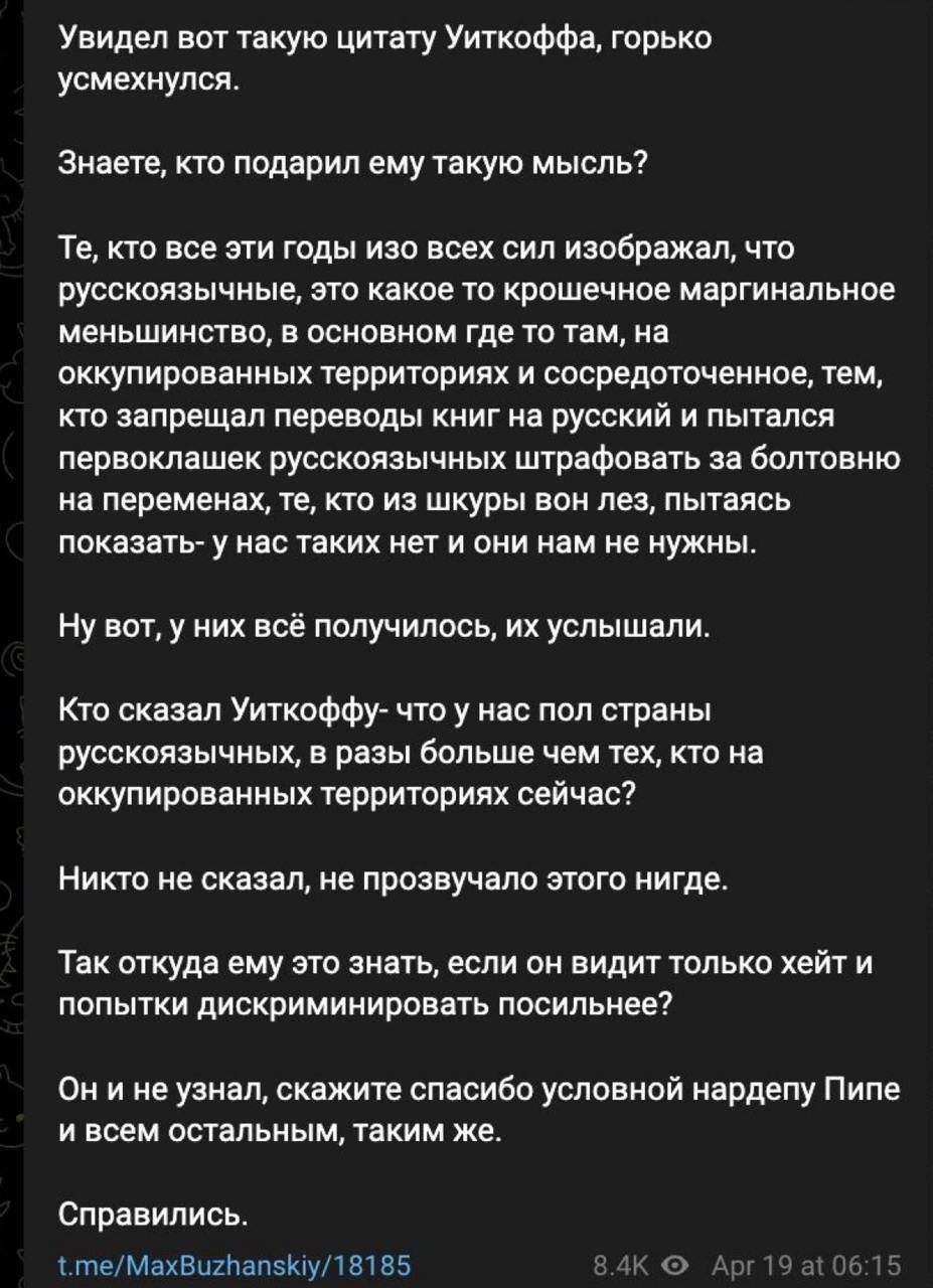 "Увидел вот такую цитату Уиткоффа, горько усмехнулся. Знаете, кто подарил ему такую мысль? Те, кто все эти годы изо всех сил изображал, что русскоязычные, это какое-то крошечное маргинальное меньшинство, в основном где-то там, на оккупированных территориях и сосредоточенное, тем, кто запрещал переводы книг на русский и пытался первоклашек русскоязычных штрафовать за болтовню на переменах, те, кто из шкуры вон лез, пытаясь показать - у нас таких нет и они нам не нужны. Ну вот, у них всё получилось, их услышали", - написал Бужанский.