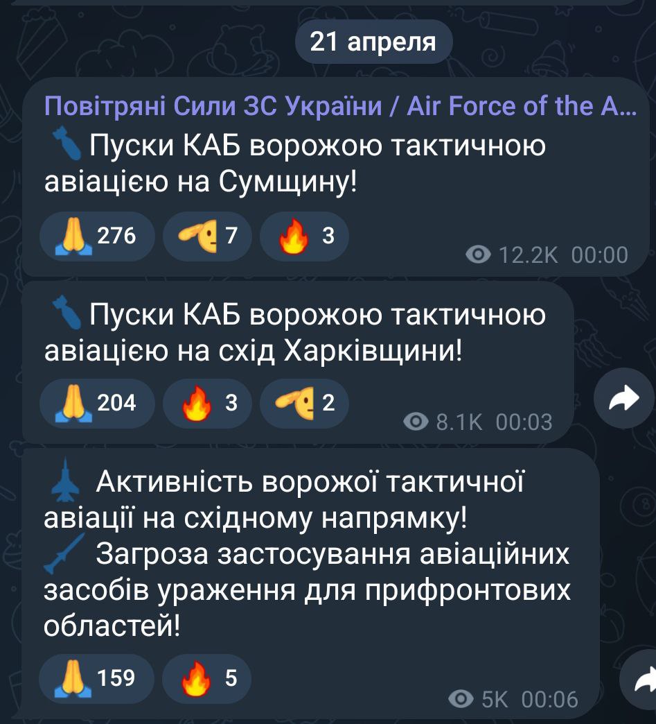 Ночью РФ возобновила воздушные удары по Украине. Воздушные силы ВСУ сообщали о пусках КАБ по Харьковской и Сумской областям.
