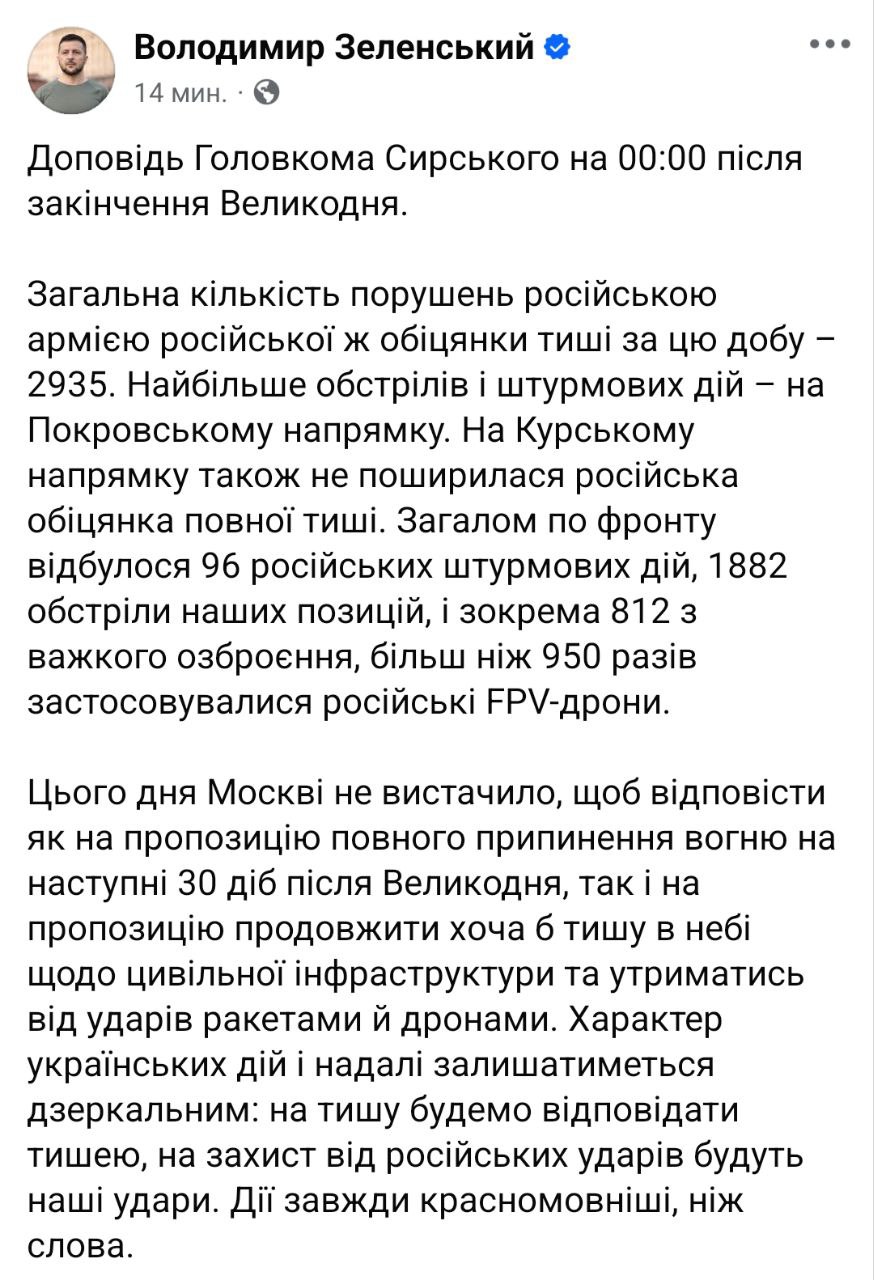 Это произошло по истечении срока пасхального перемирия. До этого Россия воздушных атак не проводила (что ранее признал и Зеленский). То есть фактически перемирие закончилось.