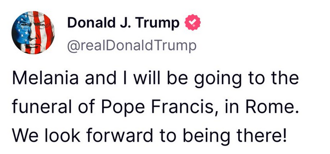 "Меланья и я поедем на похороны папы Франциска в Рим. Мы с нетерпением ждем возможности там оказаться!"- говорится в сообщении.